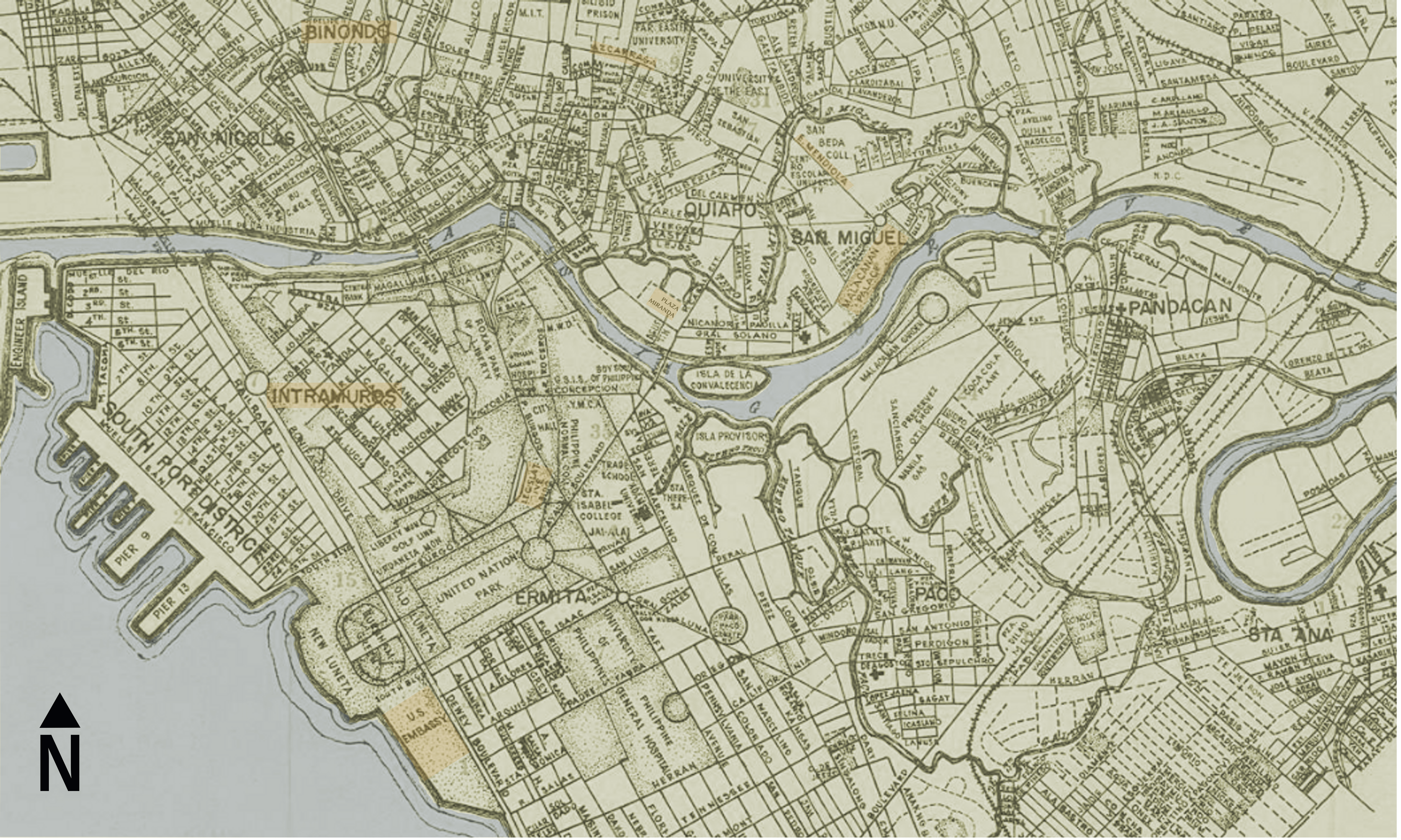 Home to the University belt district, the legislature and the Presidential palace, and the heart of working class life, the downtown Manila area was the center of Philippine politics in the post-war period. Based on D.D. de Jesus, Table and Pocket Map Guide City of Manila (1960).
